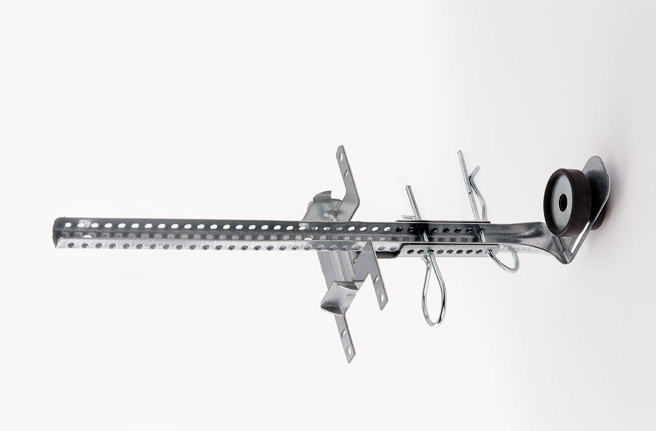 Suspente en acier galvanisé prolongée d’une allonge réglable avec en son centre une rondelle de soutien en caoutchouc et une rondelle métallique.