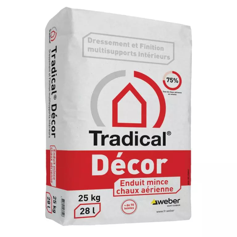 Enduit - Tradical® Décor est destiné à des applications en intérieur en dressement, finition ou sous enduit pour badigeons sur parois verticales et plafonds, voûtes, entre solives, neufs et anciens